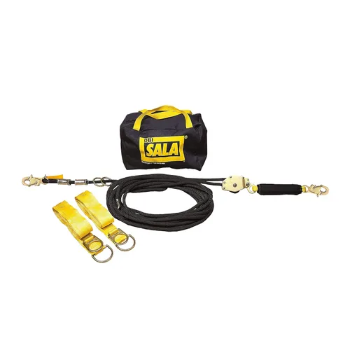 Equipado con i-Safe Capacidad del sistema flexible de 2 trabajadores Varias longitudes disponibles para adaptarse a las necesidades del lugar de trabajo. Cuerda estática ligera de 6.890 in. Sistema de cuerda de suspensión horizontal con tensor, absorción de energía, dos adaptadores de amarre de 6 pies (59.1 ft) y bolsa de transporte. Solo para uso industrial/profesional. No apto para venta o uso de consumidores. Completo de 70 pies, 69.9 ft, el sistema incluye tensor, absorción de energía y anclajes. Cuerda de seguridad ligera de 11/16 pulgadas, 0.689 in, estática Incluye dos anclajes adaptadores de 5.9 ft. Diseño extremadamente ligero y portátil. Construido en límites de absorción de energía fuerzas de detención de caída