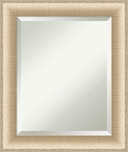 60% espejo biselado, 40% marco de poliestireno Dimensiones: El tamaño total de este espejo de tocador mide 20.75 x 24.75 pulgadas, incluyendo el marco. Su área reflectante mide 16 x 20 pulgadas, que funciona perfectamente sobre un tocador estándar. El espejo tiene un bisel de 1 pulgada. Materiales de alta calidad: No puedes equivocarte cuando eliges la calidad de los espejos hechos a mano para la decoración de tu pared. El elegante marco cepillado color miel de 3 pulgadas es un marco metálico cepillado cálido color dorado miel con acabado satinado que se angula desde el exterior al borde interior. El borde exterior tiene un ligero detalle con un acabado negro satinado. El marco mide 2.68 x 1.32 pulgadas. Todos los espejos de pared de Amanti Art están acabados con un respaldo de papel para evitar la acumulación de humedad y polvo. Fácil de colgar: Hacemos que sea fácil para ti colgar este espejo de pared dándote todo lo que necesitas. Todos los espejos tienen cables duraderos unidos en la parte posterior para colgar vertical u horizontalmente el espejo, junto con un gancho y clavo. Después de terminar o renovar tu baño, tocador o sala, todo lo que tienes que hacer es elegir el lugar, poner el clavo (realmente se sostiene con uno de nuestros ganchos) y dar por terminado el proyecto.. Hecho a mano en los Estados Unidos: Amanti Art hace todos los espejos a mano para paredes y espacios de baño en Madison, Wi. Cada miembro de nuestro equipo está capacitado para manejar e inspeccionar cada aspecto del proceso de enmarcado. Llevamos a mano tu pieza de una estación de acabado a la siguiente, luego la empacamos cuidadosamente para asegurar que llegue en las mejores condiciones. Porque nuestro enfoque es la mano de obra, nuestros productos son utilizados por arquitectos, desarrolladores, diseñadores y propietarios por igual para crear hermosos baños. Lo que hace que un espejo tenga un aspecto genial: Te verás en tu espejo todos los días. Un espejo Amanti Art mantiene su valor con un acabado prémium que puedes apreciar de cerca. Para colocar el espejo correctamente, cuélgalo para que tu reflejo (y cualquier otra persona que lo utilice diariamente) quepa en el centro.