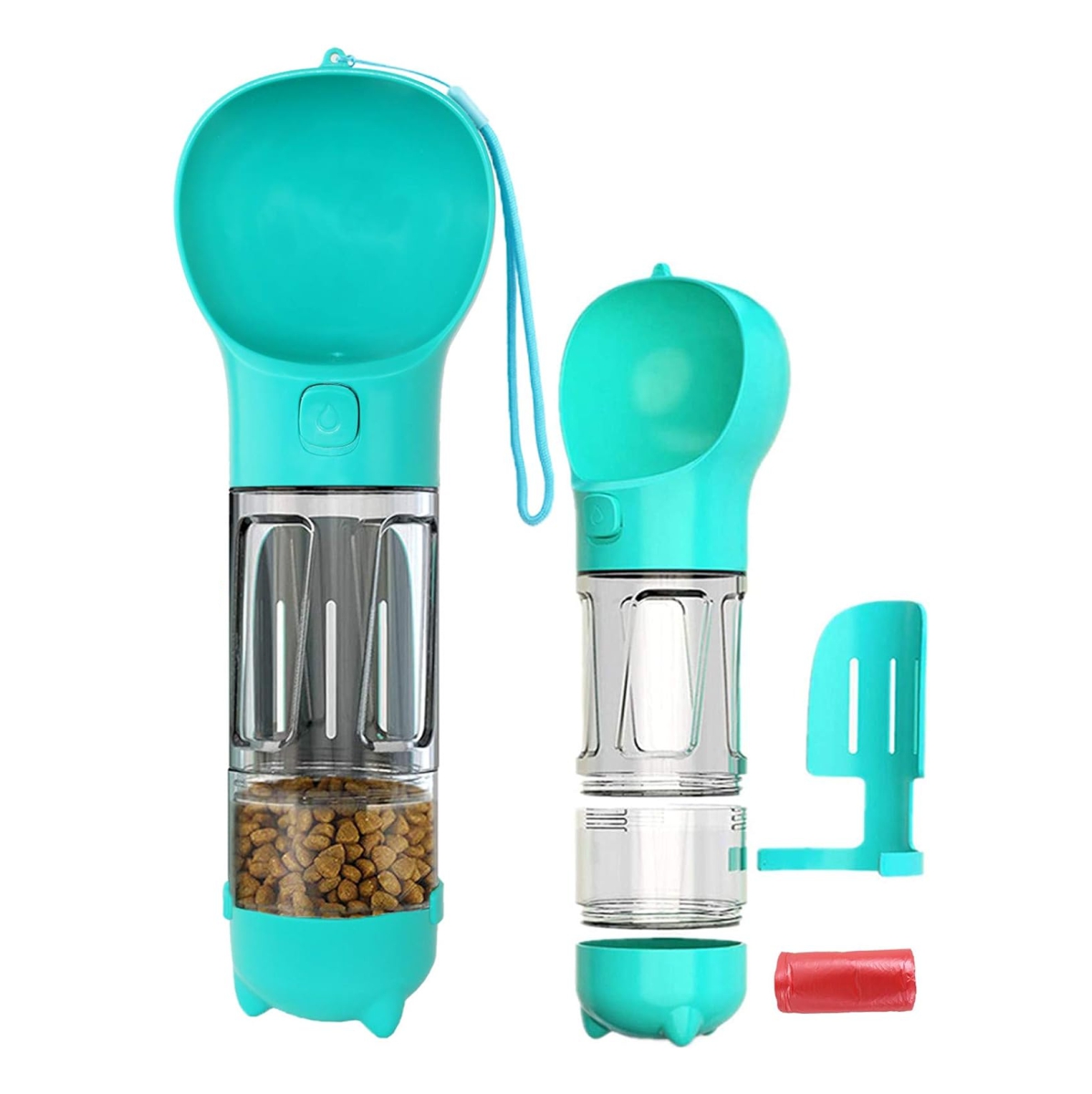 •Cuenco portátil integrado, botella de agua, tanque de almacenamiento de granos, pala de caca y bolsas de basura.