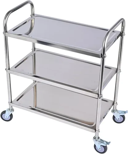 Rueda de freno silenciosa universal: el carrito de acero inoxidable Amarite cuenta con ABS de alta calidad y materiales de acero inoxidable seleccionados, lo que garantiza un funcionamiento silencioso. Incluye una función de bloqueo de freno incorporada para un frenado seguro, lo que facilita su uso en terrenos irregulares Carrito de acero inoxidable grueso de alta calidad: capacidad de carga: 420 libras, hecho de acero inoxidable grueso, fabricado con tubería redonda para una apariencia más suave y atractiva y una limpieza más fácil, conexión de hebilla de acero de alta resistencia entre capas y varillas, la capacidad de carga no se deforma, 1 mm de grosor, carrito de acero inoxidable grueso de alta calidad Carrito de acero inoxidable de tres niveles: la distancia entre cada capa de partición es de 10.6 pulgadas, y los cuatro bordes de cada capa de partición tienen un diseño de ranura, que puede evitar que sus productos se caigan y dañen durante el transporte. Tamaño del carrito de acero inoxidable: 29.5 pulgadas L 15.7 pulgadas W 37.4 pulgadas H Fácil montaje en 10 minutos: el montaje del carrito utilitario de acero inoxidable de 3 niveles no requiere pasos complicados, solo piezas simples y conexiones entre piezas. Si no lo entiendes, puedes usarlo según las instrucciones adjuntas Ampliamente utilizado: el carro de acero inoxidable es adecuado para laboratorios, salones de belleza, incluso cantinas, hoteles, edificios de oficinas, etc