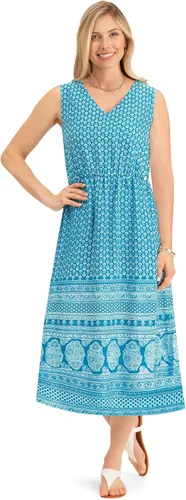 Vestido cruzado de imitación sin mangas con cuello en V y estampado de borde favorecedor Descripción Este vestido sin mangas tejido fácil de usar tiene un escote en V y una cintura elástica favorecedora con un detalle de envoltura sintética y botón decorativo. Tiene un bonito patrón floral con un bonito estampado de bordes y está disponible en dos colores elegantes. Lavar a máquina. Rayón. Importado. Aprox. 48"L. Elija: Azul marino o turquesa. Disponible en: señoritas M (10-12), L (14-16) o mujeres XL (18-20), XXL (22-24). Tipo de material: Rayón