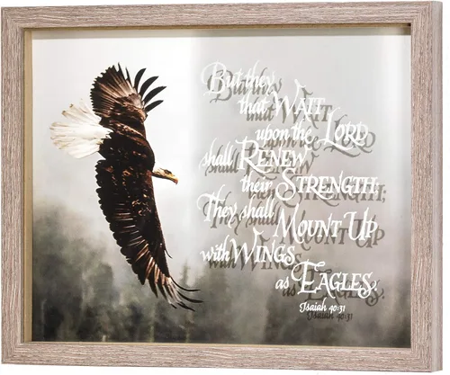 Encantador arte de pared cuenta con un majestuoso águila en alza con sentimiento: "Pero los que esperan en el Señor renovarán su fuerza; se levantarán con alas como águilas Isaías 40:31" El letrero decorativo está hecho de un material de madera duradero; se recomienda limpiar solo las manchas La placa de pared o mesa mide aproximadamente 12 x 15 pulgadas; la impresión y el vidrio miden aproximadamente 11 x 14 pulgadas Perfecto sobre un estante, colocado en una repisa o colgar de tu pared favorita; añade carácter acogedor a cualquier espacio de tu hogar Contenido en embalaje protector; listo para regalar