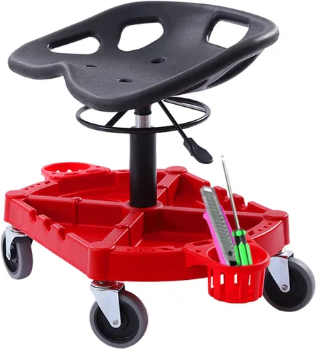 Buen ayudante para el trabajo: te permite sentarte a trabajar, en lugar de ponerte en cuclillas, para reducir la presión sobre las rodillas y la espalda baja causada por largas horas de trabajo. También puede ayudarlo a hacer un gran trabajo de reparación y mantenimiento del automóvil. Altura ajustable: puedes ajustarlo dentro del rango de altura de 19.69-25 pulgadas, por lo que te ayuda a limpiar fácilmente el techo o las ruedas inferiores del automóvil. Almacenamiento de herramientas: tiene una bandeja de herramientas organizada en la parte inferior, lo que te permite colocar algunas llaves, destornilladores y otras herramientas mientras trabajas. El diseño con agujeros te permite colocar las herramientas ordenadamente, para que puedas seleccionarlas rápidamente cuando las necesites. Resistente y duradero: la bandeja de herramientas organizada en la parte inferior hecha de polipropileno y un poste de cilindro de aire ajustable hecho de hierro son fuertes y duraderos, por lo que puedes usarla durante mucho tiempo. Diseño ergonómico: su asiento hundido y su asa ajustable de elevación están diseñados ergonómicamente y dedicados a crear condiciones de trabajo más cómodas para ti