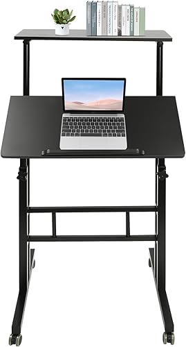 Elevación libre: este escritorio móvil de pie puede ajustar la altura de la mesa de acuerdo a tu altura o la altura del asiento, el rango ajustable es de 27.5 a 45.3 pulgadas, lo que ayuda a reducir el dolor de espalda y lumbar y mejorar la mala postura al sentarse. Panel basculante: el escritorio de pie con ruedas se puede inclinar 180° ajustando la perilla, lo que te permite encontrar el ángulo más adecuado para un uso más cómodo, con un deflector en la parte inferior para proteger tu laptop, teclado, libros, etc. de resbalar. Escritorio doble: la estación de trabajo de escritorio de computadora de pie está diseñada como dos escritorios, que se pueden utilizar por separado o armar para formar un escritorio más grande. Hay cuatro ruedas universales en la parte inferior del escritorio de computadora móvil, y las ruedas universales se pueden fijar, lo que es conveniente para mover sin dañar el suelo. Material de alta calidad: el escritorio móvil de pie está hecho de MDF de alta calidad y soporte de acero al carbono, que es resistente y duradero, y no se deforma ni rompe fácilmente. El uso de pintura para hornear y tecnología de chapa hace que el producto sea resistente a la corrosión, no se desvanezca fácilmente y prolonga la vida útil. Construcción resistente: el carrito de computadora con ruedas se compone de 2 soportes de base en forma de T, barras transversales, 4 soportes gruesos, acero al carbono de alta resistencia hace que la estructura sea más fuerte, y su soporte es de hasta 22.04 libras (el más alto) y 44.09 libras (más bajo), por lo que puedes usarlo con confianza.