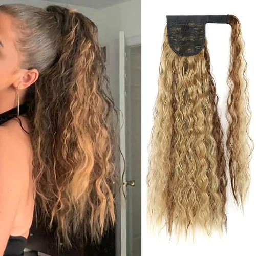Extensiones de cabello ondulado con cola de caballo, 22 pulgadas de largo, ondulado, rizado, envolvente, cola de caballo, resistente al calor