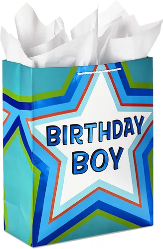 Hallmark Bolsa de regalo de cumpleaños extra grande de 15 pulgadas con papel de seda (estrella verde y azul "Birthday Boy")