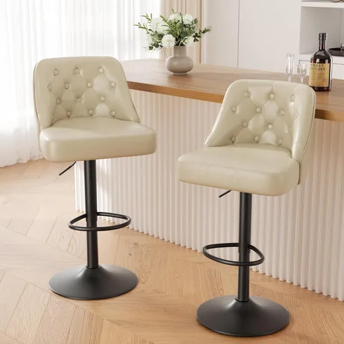 Altura ajustable y giro de 360°: ajusta fácilmente la altura de estos taburetes de bar para adaptarse a diferentes alturas de mostrador y mesa de 35 a 45 pulgadas de alto, gracias al mecanismo de elevación de gas suave. Rango de altura del asiento del taburete de 25.5 a 33.5 pulgadas. El asiento giratorio de 360 grados proporciona una rotación suave y un movimiento fácil, perfecto para socializar y alcanzar artículos mientras estás sentado. Asiento de diseño ergonómico: el respaldo alto, el cómodo cojín grueso y el robusto diseño de reposapiés de estos taburetes tapizados de barra de altura de mostrador proporcionan un apoyo ergonómico, promoviendo una postura adecuada y reduciendo las molestias durante largos períodos de sentado, lo que lo convierte en una opción de asiento confiable para el uso diario. Antideslizante y estabilidad: la base ampliada hace que el taburete de bar sea más apoyo y equilibrado. Capacidad máxima de carga de hasta 330 libras. Tamaño del asiento grande: 15.7 pulgadas de profundidad x 18.2 pulgadas de ancho; y nuestro taburete de bar tiene un anillo de goma para evitar que tu piso se raye y también evita ruidos repugnantes al moverse. Siéntete seguro de usarlos en varias superficies de pisos, incluyendo madera dura, baldosas y alfombras. Clásico y ampliamente utilizado: mezcla estilos vintage y modernos, este taburete de bar retro de piel sintética cuenta con un diseño clásico con detalles elegantes en todas partes. El respaldo está adornado con botones y presenta una curva elegante. Ideal para islas de cocina, bares caseros, áreas de mostrador y espacios de comedor, estos taburetes combinan funcionalidad con estilo. Fácil de montar y limpiar: fácil de montar y limpiar: proceso de montaje sencillo con instrucciones (idioma español no garantizado) y accesorios incluidos, lo que permite una configuración rápida y sin complicaciones de los taburetes de barra de altura de mostrador. Los conjuntos de artículos múltiples se empaquetarán por separado y se entregarán individualmente en un corto período de tiempo. Resistente a las manchas y al agua, fácil eliminación de manchas con solo un paño húmedo, ahorrando tiempo y molestias a largo plazo.