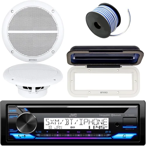 El paquete incluye: 1 JVC KD-T92MBS Single DIN Marine Bluetooth USB AUX AM/FM Radio estéreo receptor reproductor de CD = 1 par de Enrock Marine de 6.5 pulgadas blanco 2 vías resistente al agua 90 vatios altavoces = 1 Enrock EMCWT1 resistente al agua protector de radio tintado, 1 carrete Enrock Marine de 50 pies de 18 pies. Cable de calibre RECEPTOR ESTÉREO: Este receptor de deportes marinos y de motor JVC viene equipado con todas las opciones de medios que necesitas para llevar el sistema de información y entretenimiento de tu vehículo al siguiente nivel. Este receptor cuenta con reproducción de CD y un sintonizador AM/FM clásico para que pueda elegir entre escuchar sus propias canciones y las ondas de radio con facilidad. RECEPTOR ESTÉREO: La conectividad Bluetooth le permite conectar cómodamente su dispositivo de mano preferido al receptor, mientras que el puerto USB permite una carga de alta corriente para mantener su dispositivo alimentado durante todo su viaje ALTAVOCES DE 6.5": Los Enrock EM602W son altavoces de 2 vías duraderos y potentes, de tamaño de 6.5", y están diseñados para brindarle sonido y estilo producidos con precisión. Los altavoces están moldeados con la máxima protección, lo que hace de esta una excelente opción para todas tus necesidades de audio al aire libre. Cubierta del receptor y cable del altavoz: mantenga su radio marina protegida de los elementos con esta nueva cubierta impermeable blanca totalmente sellada. El artículo cuenta con un panel frontal teñido de policarbonato y carcasa de plástico ABS estabilizado a los rayos UV. Incluye acero inoxidable, accesorios de montaje inoxidables. Utiliza el cable de altavoz Enrock Marine calibre 18 para conectar tus altavoces a la radio.