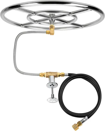 Diámetro del anillo para quemador de hoguera de 18 pulgadas Material del anillo del quemador: Acero inoxidable 304# duradero, entrada de gas hembra de 1/2 pulgada, 147.000 BTU máx Diseño elegante: Nuevo diseño de barras cruzadas para una mejor distribución del gas y un gran aspecto para tu fogata Aplicabilidad: Gas natural Contenido del paquete: Quemador redondo de 18 pulgadas; brida y llave cromadas y pulidas; entrada de 1/2 pulgada que incluye enchufe de entrada y llave; una manguera de 1 PSI x 152,4 cm; tubo flexible de 24 pulgadas; conectores y manual de instalación