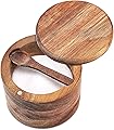 Cuenco de Madera de Acacia para Sal y Pimienta, Salero de Madera Natural y Caja de Almacenamiento de Especias con Cuchara Incorporada y Tapa