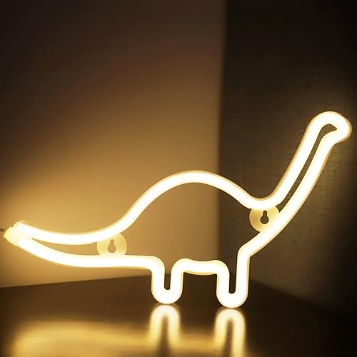 1. Luces de neón de dinosaurio: letrero LED de dinosaurio con luces brillantes, un adorno llamativo ideal para ayudarte a crear un ambiente de ensueño e interesante. Lleva a tu hijo a una extraña jungla y estimula aún más la imaginación. 2. Funciona con pilas y alimentado por USB - 2 opciones de alimentación: una es la energía de la batería, solo 3 pilas AA (no incluidas) y hay un interruptor de encendido/apagado en la caja de la batería para controlar esto. El otro es el enchufe USB, brilla más cuando lo conecta a un puerto USB. 3. Fácil de colgar en la pared: debido al diseño de agujeros para colgar, puedes colgarlo en la pared o simplemente colocarlo en la mesa, escritorio, estante o tocador. 4. Tubo de neón seguro: esta lámpara de copa de vino está hecha de tubo de neón suave e irrompible, luz LED con bajo voltaje, sin calor en absoluto. No hay necesidad de preocuparse por regalarlo a tus hijos, niñas, niños, adolescentes, amigos, etc. 5. Ideal para decoración de habitaciones: esta luz LED de neón se puede utilizar en tu hogar, dormitorio de los niños, habitación del bebé como vacaciones, boda, fiesta de cumpleaños, día de San Valentín, Halloween, decoraciones de Navidad y adecuada para otras ocasiones de celebración.