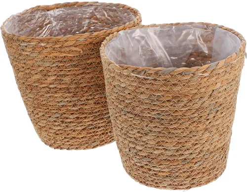 Descripción Almacenamiento creativo: más que macetas de interior y exterior, estas son una solución de almacenamiento simple para organizar maquillaje, lociones, artículos de tocador, utensilios de cocina o cualquier cosa que necesite almacenamiento. Multifuncional: la cesta no es una maceta para interiores o exteriores, sino también un simple soporte de almacenamiento para maquillaje, necesidades diarias, juguetes y verduras. Ampliamente utilizado en la sala de estar, dormitorio, baño, guardería o cocina. Además, complementan una serie de entornos de decoración y se han engranado perfectamente en toda su casa. Características - Color: Marrón claro. - Material: Hierba marina, PE. - Tamaño: Aproximadamente 22. 00X21. 00X15. 0.0 in El paquete incluye: 2 canastas