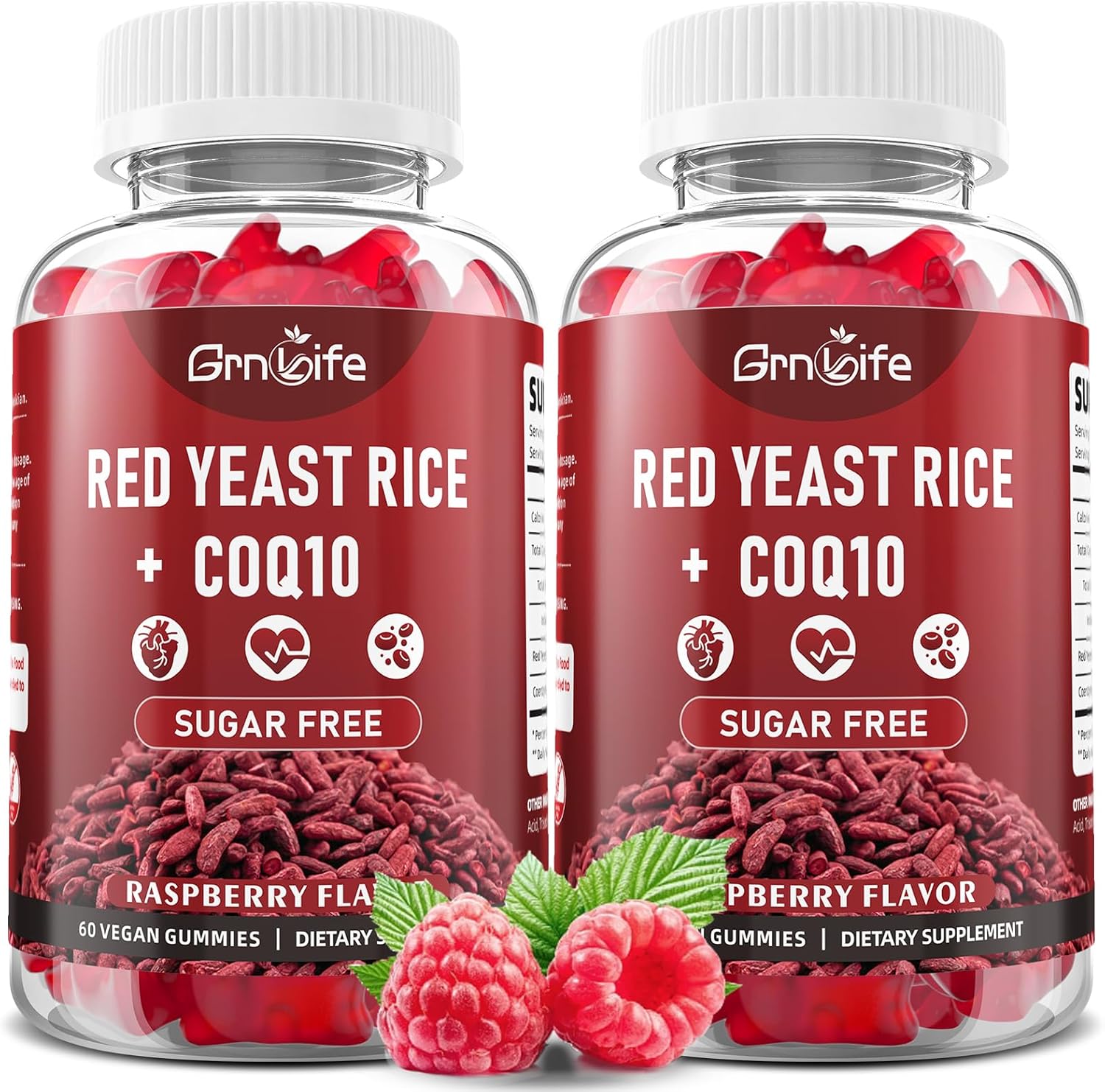 Paquete de 2 arroz de levadura roja con gomitas Coq10, suplemento de arroz de levadura roja, sin azúcar, sabor a frambuesa, 120 unidades