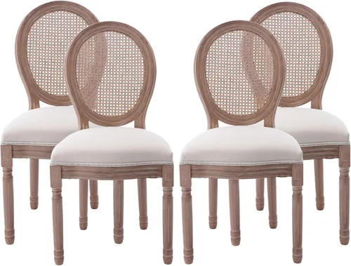 Nrizc - Juego de 4 sillas de comedor de estilo francés rústico, sillas de tela de granja con respaldo redondo, silla de comedor de ratán, sillas