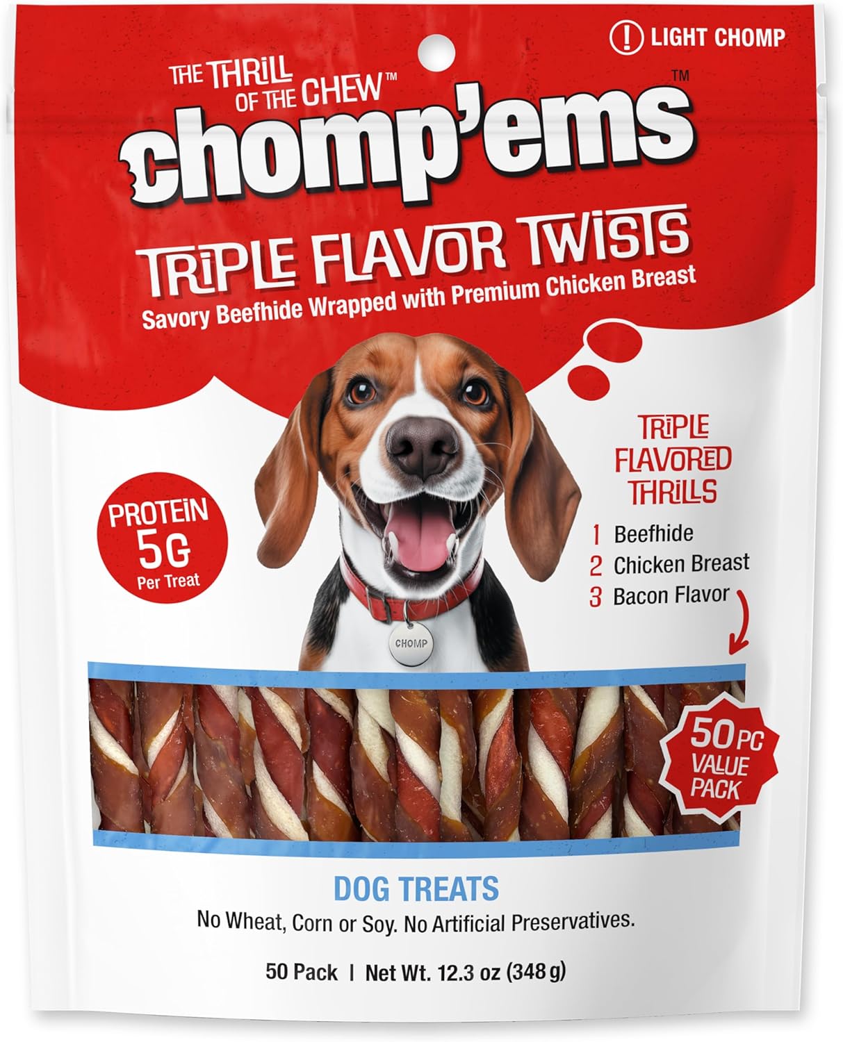 CHOMP 'EMS Palitos giratorios de cuero crudo de triple sabor – Masticables para perros de piel de res, 50 unidades