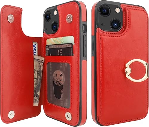 ONETOP - Funda tipo cartera para iPhone 13 con soporte para tarjetas, anillo de rotación de 360°, bloqueo RFID, piel sintética, doble cierre magnético, a prueba de golpes, para mujeres y niñas, 6.1 pulgadas (rojo)