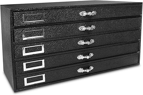 Nota del producto: cuenta con (5) cajones de 1-1/2 pulgadas de profundidad y tienen asas de tracción. Color: negro. Tamaño: mide 15 1/2 x 8 3/4 x 7 5/8 pulgadas de alto. Peso neto: 16.5 libras