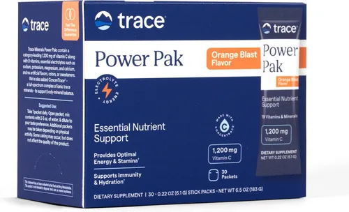 Multivitamínico y multimineral: la mezcla de bebidas en polvo Power Pak proporciona 1,200 mg de vitamina C más un espectro completo de más de 70 oligoelementos y vitaminas para promover la inmunidad y el bienestar de todo el cuerpo Promueve la salud general: Apoya la inmunidad, la energía, la resistencia, la hidratación y más con vitaminas, electrolitos y oligominerales de espectro completo que funcionan sinérgicamente para promover la salud en general La mayoría de las personas son deficientes en minerales: la agricultura moderna y la filtración de agua eliminan los minerales de las dietas modernas. Añade vitaminas y minerales esenciales a tu dieta con Power Pak 17 deliciosos sabores: Power Pak viene en 17 sabores y está convenientemente disponible tanto en paquetes de una sola porción como en botes. Obtén tus vitaminas y minerales diarios en un solo paquete o cucharada Cosechado de forma sostenible en los Estados Unidos: Durante más de 50 años, Trace ha estado cosechando minerales de manera sostenible y formulando productos que facilitan dar a su cuerpo los minerales que necesita