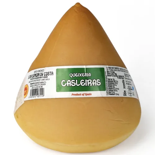 San Simon Da Costa DOP es un queso de leche de vaca pasteurizado semi-blando de España. Ligeramente salado con un sabor lechoso, este queso es una deliciosa adición a cualquier tabla de queso o receta. Este queso de color amarillo cremoso en forma de lágrima se envejece y madura durante un mínimo de 30 días. Tiene un sabor amaderado y una textura cremosa mantecosa que es semidura, semi-elástica y densa. La cáscara es dura, ahumada y dorada desde el interior con pequeños ojos. Durante la preparación en San Simon, se presiona ligeramente y luego se fuma con madera de abedul, dándole su toque ahumado y aroma amaderado único y sabor ligeramente ácido.