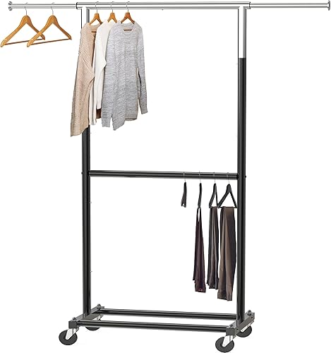 La barra doble proporciona espacio de separación para colgar pantalones, camisetas Construido con acero resistente, elegante pintura negra y acabado cromado Construcción de metal resistente y fácil montaje. Ideal para dormitorios de estudiantes Barra horizontal superior extensible de 30.5 a 47.25 pulgadas Dimensiones: 15 pulgadas de profundidad x 65.2 pulgadas de alto x 30.5 pulgadas de ancho