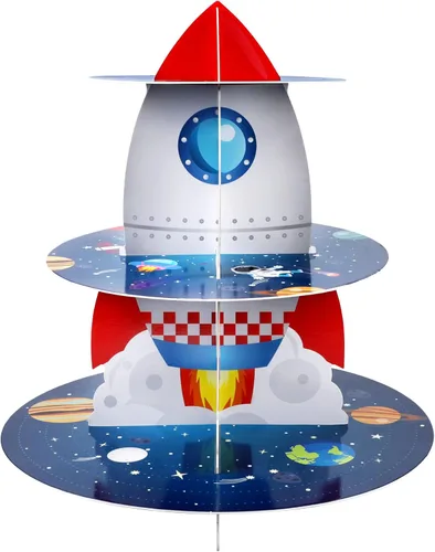 Soporte para magdalenas espaciales, diseño de cohete para cumpleaños, 3 niveles, soporte de cartón para cupcakes, torre de postre estilo galaxia