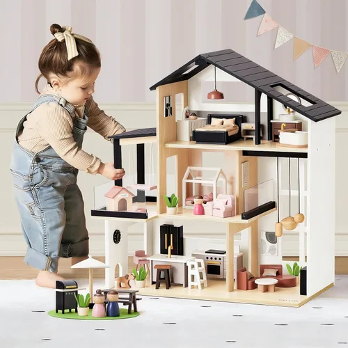 ¿Para qué sirve Tiny Land Casa de muñecas, casa de muñecas familiar moderna con diseño realista, casa de muñecas de madera con muebles de 53 piezas, regalo ideal?