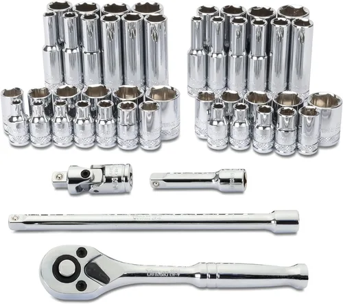 El juego incluye: (10) enchufes SAE de 6 puntos, (10) enchufes profundos SAE de 6 puntos, (13) enchufes métricos de 6 puntos, (10) enchufes profundos métricos de 6 puntos (2) extensiones, (1) trinquete QR de 72 dientes y (1) junta universal Los enchufes cuentan con carga en las esquinas para ayudar a evitar el redondeo de los sujetadores, cables biselados para una colocación rápida y fácil en herramientas de accionamiento y sujetadores, base moleteada para un agarre seguro y bola de retención para una retención segura del zócalo Enchufes fabricados con acero CR-V para mayor resistencia y durabilidad y acabado con un cromo pulido resistente a la corrosión que se limpia fácilmente de aceite y suciedad El trinquete de liberación rápida de lágrima de 72 dientes para aplicaciones de alto par cuenta con un giro de arco de 5 grados para maniobrabilidad en áreas restringidas Los componentes cumplen o superan los estándares ANSI y se empaquetan en una funda de transporte duradera para un fácil almacenamiento