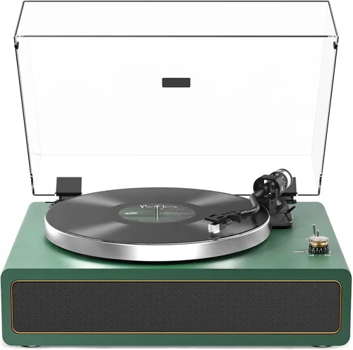 Tocadiscos todo en uno: altavoces estéreo integrados, reproducción inalámbrica, entrada auxiliar, salida RCA, velocidad 33 y 45 y parada automática, que es una máquina todo en uno. Está equipado con cuatro altavoces, incluidos dos altavoces agudos y dos altavoces de tono bajo. El tocadiscos ofrece un rendimiento estéreo de alta fidelidad y potente y te coloca en una maravillosa atmósfera musical Diseño vintage y exquisito: hecho de madera de alta calidad con un aspecto muy atmosférico y vintage. No solo es un tocadiscos, sino que también es una decoración del hogar que muestra un gusto personal en la decoración del hogar, que puede ser una decoración de sala de estar/dormitorio/estudio. Además, se puede utilizar como un hermoso regalo para todas las edades Accesorios completos y de alta calidad: el contrapeso ajustable y la bandeja de aluminio garantizan que el plato giratorio permanezca en una posición equilibrada. La aguja AT-3600 y el brazo de tono en forma de "S" permiten que el brazo tenga un mejor rendimiento de seguimiento y relación de momento de fuerza y puede reproducir una calidad de sonido más delicada. Los accesorios de alta calidad permiten que el tocadiscos tenga una mejor calidad de sonido y una vida útil más larga Múltiples opciones de reproducción para ti: el tocadiscos tiene 33 y 45 RPM para reproducir discos directamente. Al mismo tiempo, puede cambiar a PH para conectar altavoces pasivos y cambiar a LINE OUT para conectar altavoces activos. Además, también puedes conectar el tocadiscos a tu teléfono celular y otros dispositivos para reproducir cualquier canción que quieras escuchar (recuerda ajustar el volumen del dispositivo y el volumen del reproductor de discos al mismo tiempo) Fácil de usar: combina tocadiscos, preamplificador y altavoces, incluso los principiantes pueden aprender a usarlo rápidamente. Si tiene alguna pregunta sobre nuestro tocadiscos, no dude en ponerse en contacto con nuestro soporte técnico