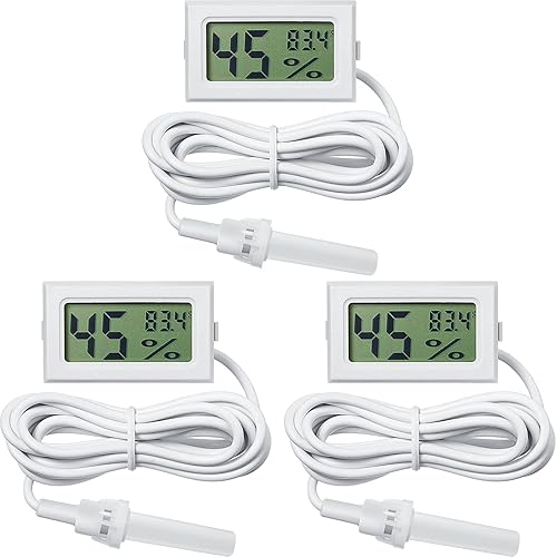 El paquete incluye: recibirás 3 termómetros higrómetros digitales con lectura precisa, puedes usarlos para tus múltiples propósitos Ocasiones adecuadas: el medidor de termómetro higrómetro con diseño de sonda puede proporcionar una lectura precisa, lo cual es adecuado para incubadoras, invernaderos, tanque de reptiles, estuche de guitarra, restaurante y oficina, puedes controlar la temperatura y la humedad oportunamente Rango de medición: el higrómetro digital muestra en Fahrenheit, la medición de temperatura está entre -58 grados Fahrenheit y 158 grados Fahrenheit; el rango de medición de humedad es del 10% al 99% RH; la precisión de medición de temperatura es de aproximadamente 2 grados Fahrenheit; la precisión de medición de humedad es de aproximadamente 5%; Respuesta rápida cada 10 segundos Fácil de leer y usar: con una gran pantalla LCD, el dígito es fácil de leer, puedes leer fácilmente incluso a distancia; simplemente coloca la sonda del sensor en el lugar que quieras medir, ten en cuenta que la sonda del sensor no es impermeable, no la utilices como termómetro de acuario Material de calidad: el termómetro higrómetro digital está hecho de material ABS de calidad, confiable y ligero, la pantalla LCD es fácil de leer; además, la sonda de acero inoxidable hace que la lectura sea más precisa