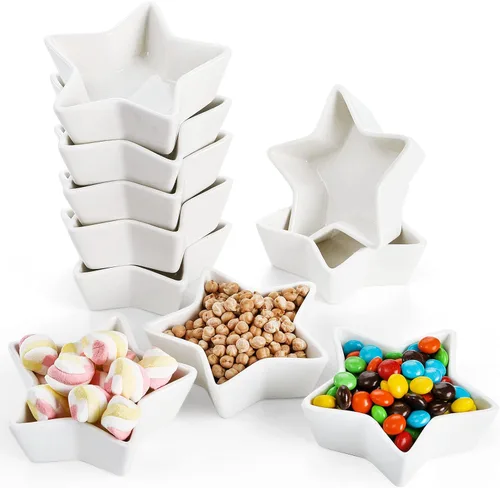Paquete económico: Obtendrá 10 piezas de plato de salsa de cerámica de este paquete, cantidad suficiente para sus diferentes necesidades. Tamaño para cada uno: 4.4 pulgadas de largo x 4.3 pulgadas de ancho x 1.4 pulgadas de alto. Bonito diseño: la forma de estrella hace que la cena sea más interesante y romántica, el color blanco hace que se vea elegante y es adecuado para cualquier vajilla. Multiuso: estos platos de salsa son perfectos para vinagre, soja, salsa, wasabi, aceite de chile, aperitivos y guarniciones en buffet, barbacoa y cena de fiesta, también adecuados como platos para anillos. Material de alta calidad: el juego de platos de salsa ZEAYEA está hecho de porcelana de alta calidad, resistente y duradera, fácil de limpiar, adecuado para el uso diario en restaurantes, hoteles y hogares, puede durar mucho tiempo. Gran regalo: este pequeño tazón de salsa puede ser un gran regalo para tus amigos en la fiesta de inauguración de la casa, Navidad o cualquier día festivo o celebración. Tus amigos estarían muy felices de recibir un regalo tan dulce.